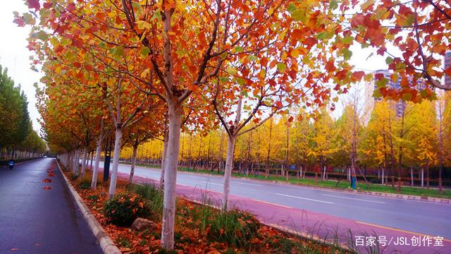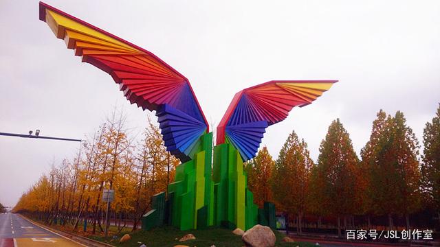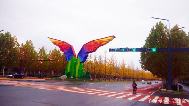 走到沣景路十字,你会看到一座新建的不锈钢雕塑,在后面银杏的陪衬下,显得更美。有人说像蝙蝠,有人说像大鹰,有人说像海燕,你看像什么?能说说吗?这是九月份正在修建时的照片,那时人们就在探讨这是什么不锈钢雕塑,它的寓意是什么?不锈钢雕塑周边的风景也很美,这是东边的马路,一边是绿叶,一边是红叶,秋景很浓。沣西新城管委会就在这里,这是管委会门前马路景色。